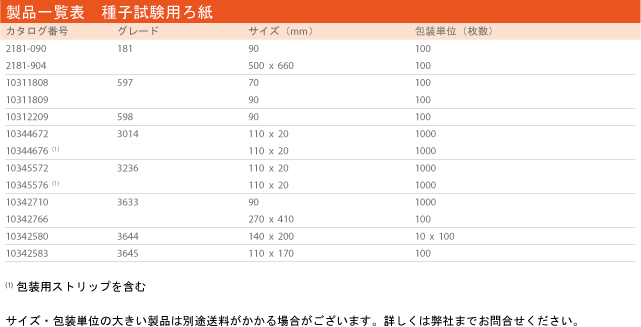 種子試験用ろ紙(グレード3014 110×20 mm) | 1,000 枚 | 10344672 | 259,900 | ||||