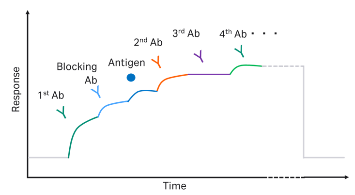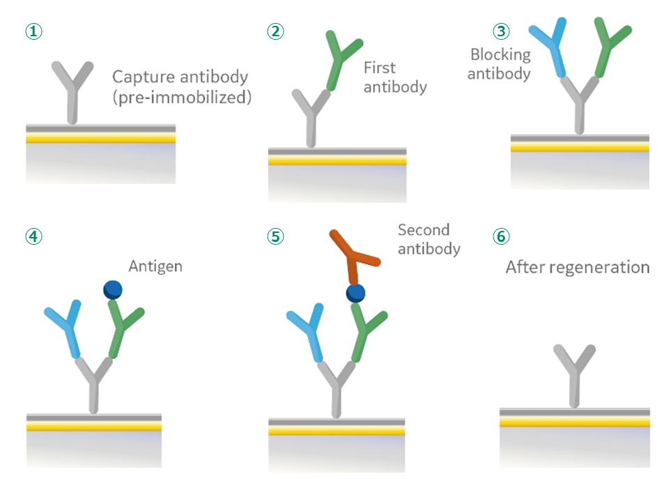 また、Biacore™の検出原理であるSPR技術を用いると、分子間相互作用をノンラベルでモニターすることができるため、抗原に対して複数の抗体が結合する多段階反応を、リアルタイムでモニターすることが可能です。